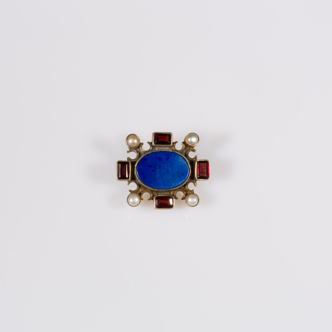 Lega di argento e rame dorato con perle e pietre naturali.